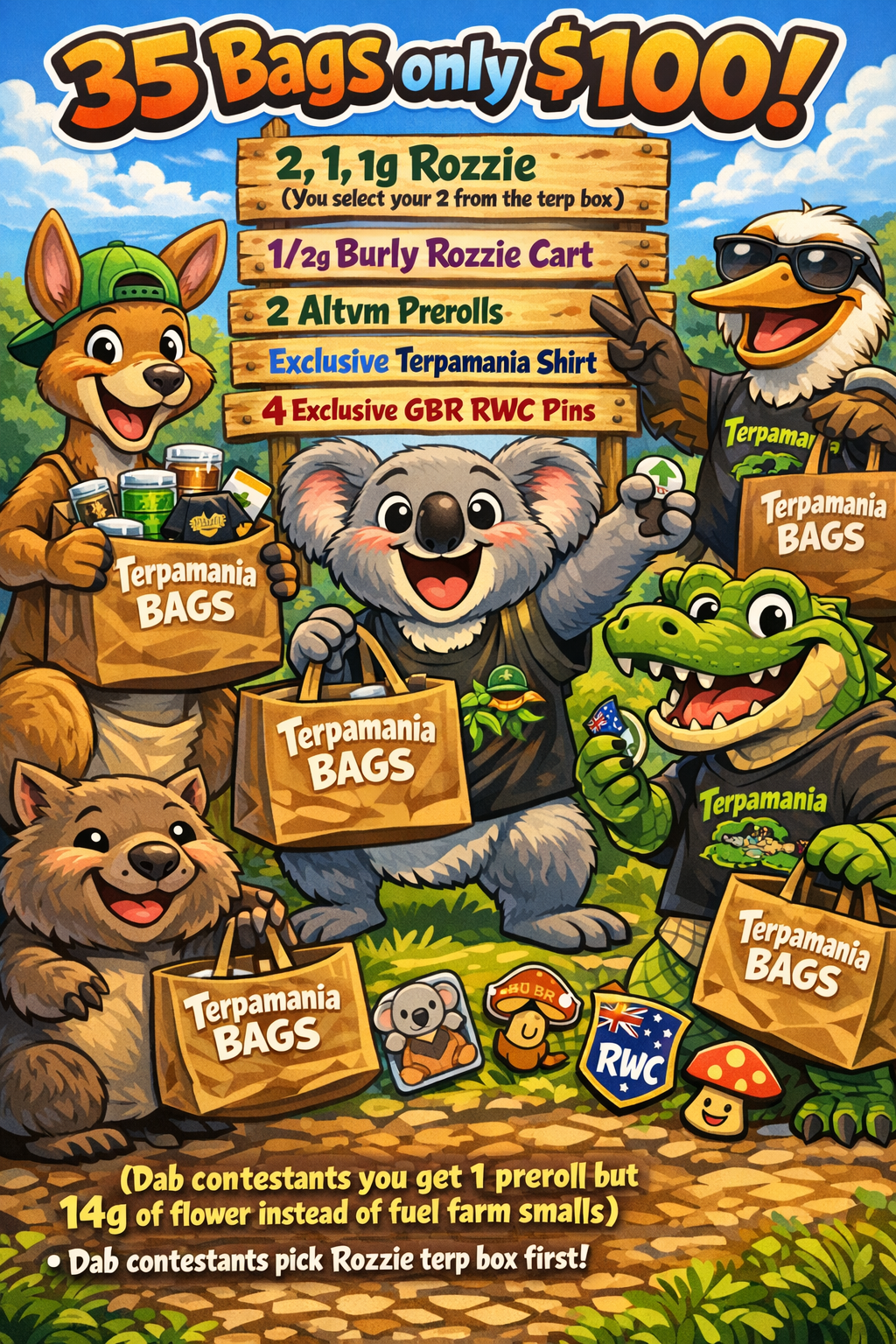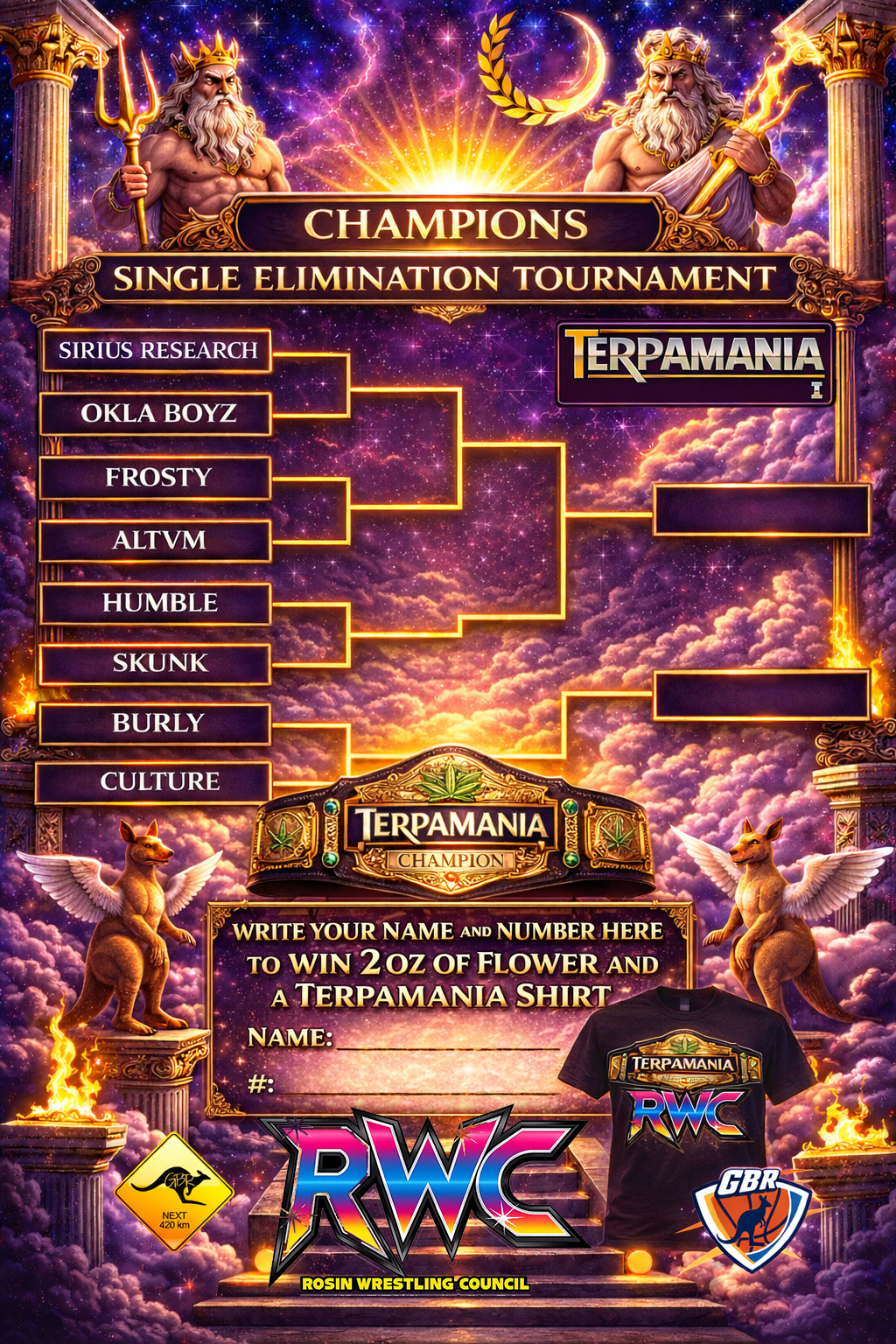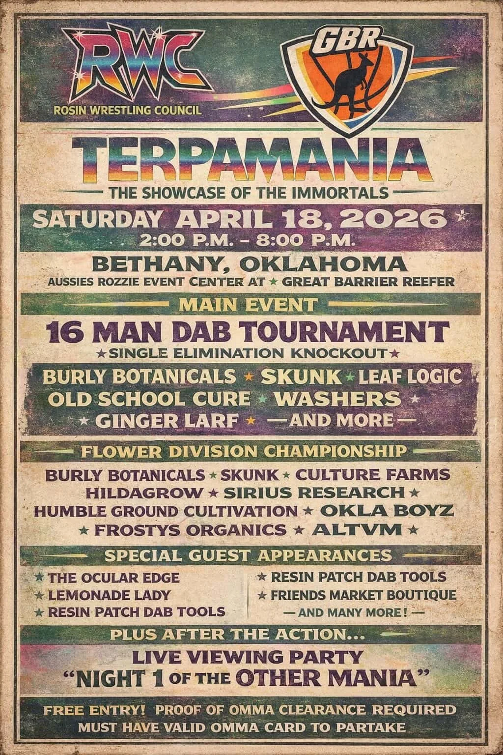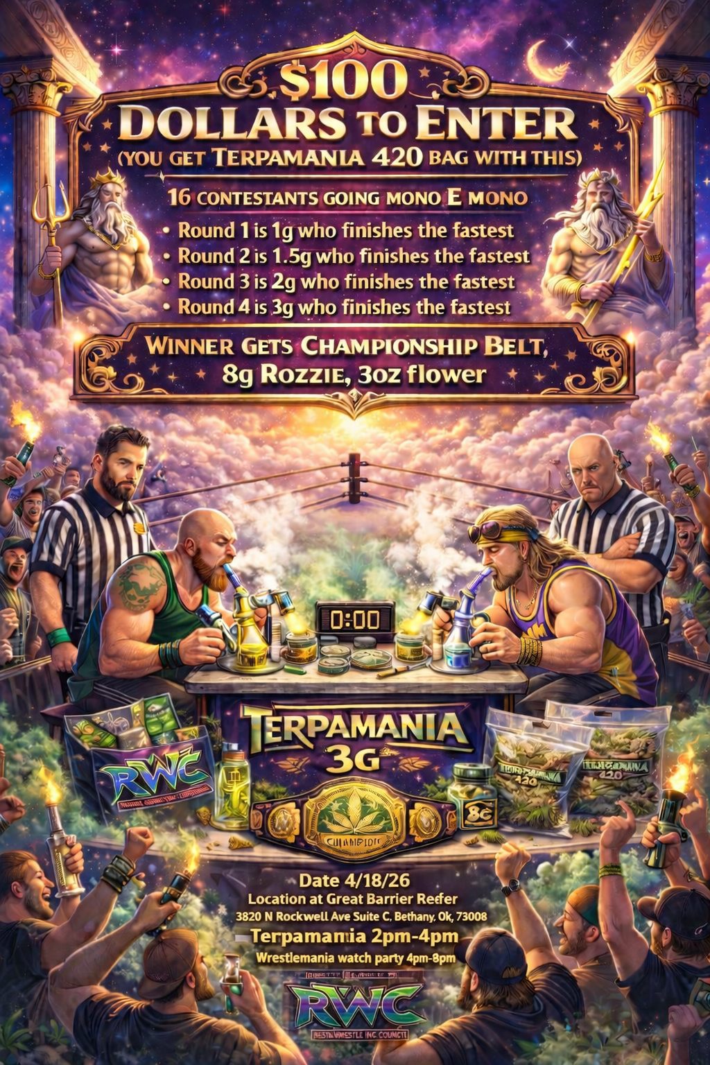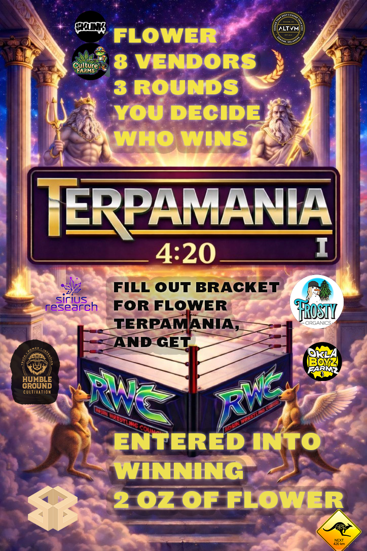 terpamania 4/18/26 from 2pm-4pm is official mates. more info will come as of now we will have 16 contestants $100 to enter in the terpamania dab challenge. round 1 we will have you going head to head against another contestant, who ever dabs 1g the fastest moves onto the 2nd round. 2nd Round is 1.5g and then only 8 contestants will battle one on one and winner moves onto 3rd round. 3rd round consists of the final 4 going one one one and who can dab 2g the fastest then winner moves onto the chamionship round where the final 2 see who dabs 3g the fastest. The winner will receive 8g of Rozzie and 3oz of Flower and the terpamania championship belt. spots are filling up fats so please message us if you want to be a contestant.