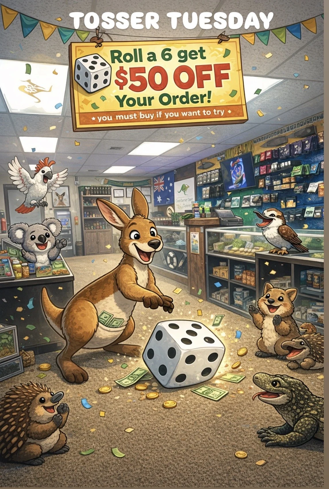 ENjoy tosser tuesdays mates. you have a 1 in 6 chance to win $50 off every tuesday, one roll per patient mates. Hope you are the lucky tosser mate